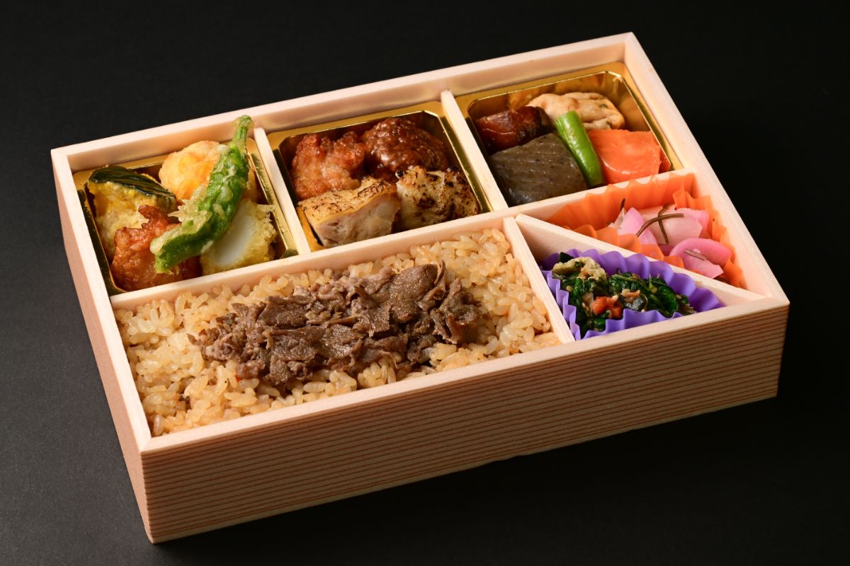 牛・鶏・豚、三種の肉が入った幕の内弁当